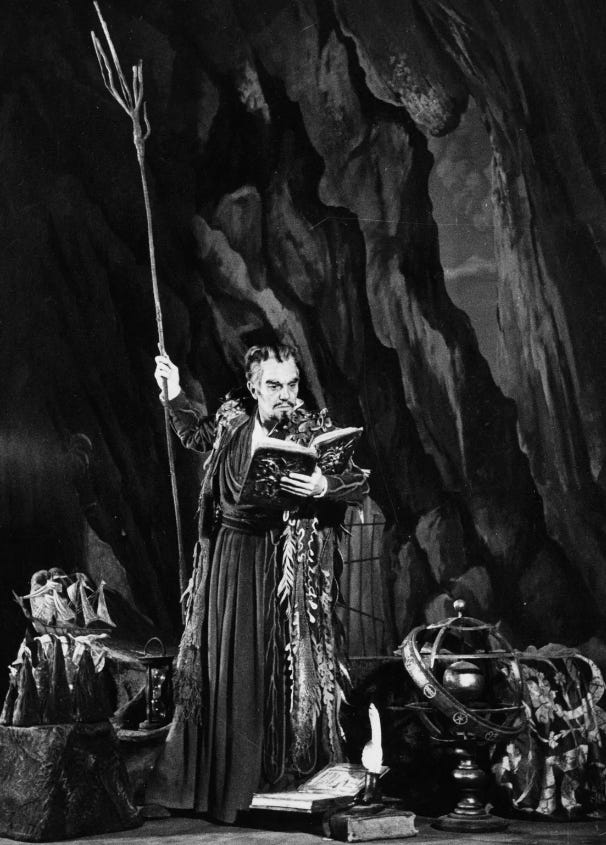 Prospero is good at pretending to be crueller and angrier than he feels. He feigns disapproval of the young prince Ferdinand who has fallen in love with Miranda, testing his courage and sincerity by putting him to backbreaking work before finally revealing that he approved of the match all along. When he interacts with his unruly magical servants, he is capable of switching between benevolent encouragement and what I believe is known in footballing terms as The Hairdryer Treatment.