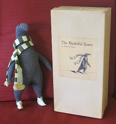 There are two common versions of where Gorey got the idea for The Doubtful Guest. One is that the creature is a projection of his own eccentric personality, a vision of how Gorey imagined he came across to his hosts. The Guest is likewise an awkward introvert plagued with strange fixations, and the little canvas shoes and winding Harvard scarf are surely a send up of Gorey’s own distinctive style.