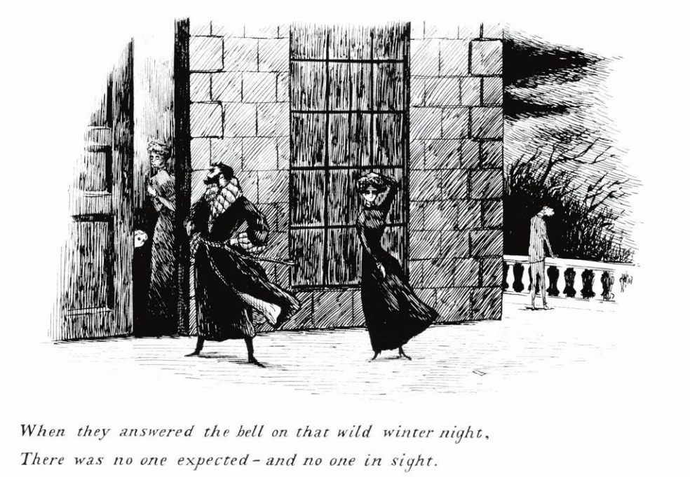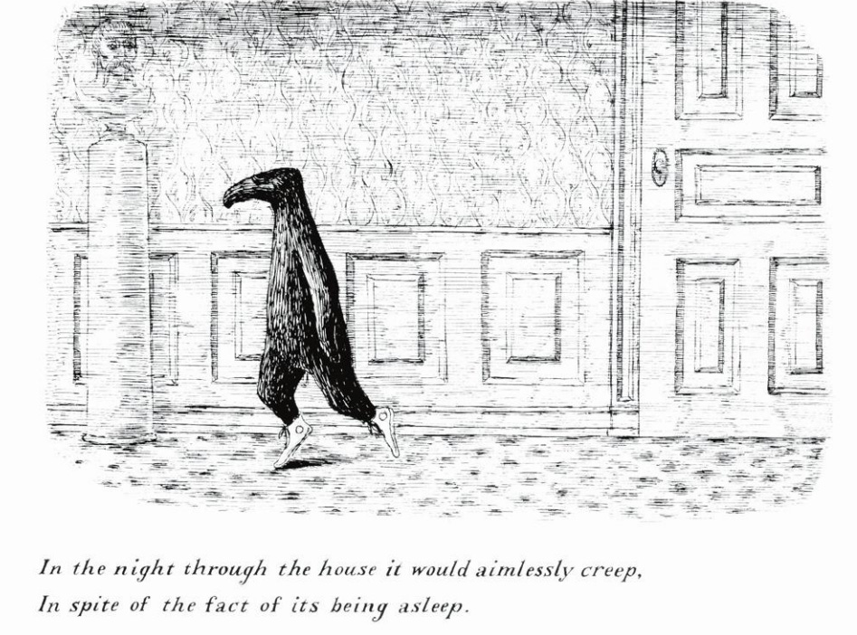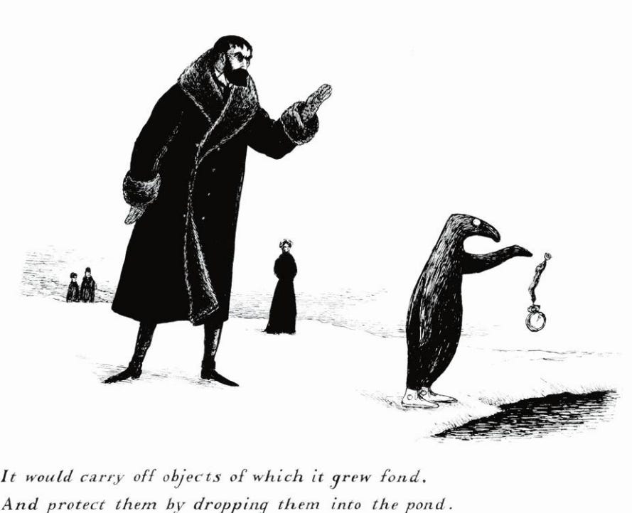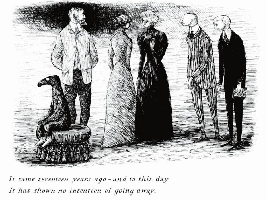 Edward Gorey’s illustrated books are mostly set in spacious, finely decorated houses ripe for the invading. As we learned last week, Gorey’s adult characters are often impotent in the face of peril. Sickly, melancholic, and too embarrassed to call the police when something goes wrong, they seem as fragile as the elegant ceramics balanced on each piece of spindly furniture.