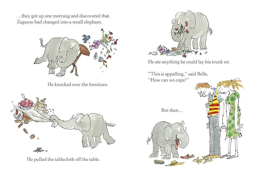 The fact that it stays for seventeen years without leaving also seems to capture the impact of a child upon the civilised members of a household. This aspect of the text prefigures the much less sinister Quentin Blake tale ‘Zagazoo’ where a couple is visited by a creature that mutates through various developmental stages in the form of animals, including a rampaging toddler-like elephant.