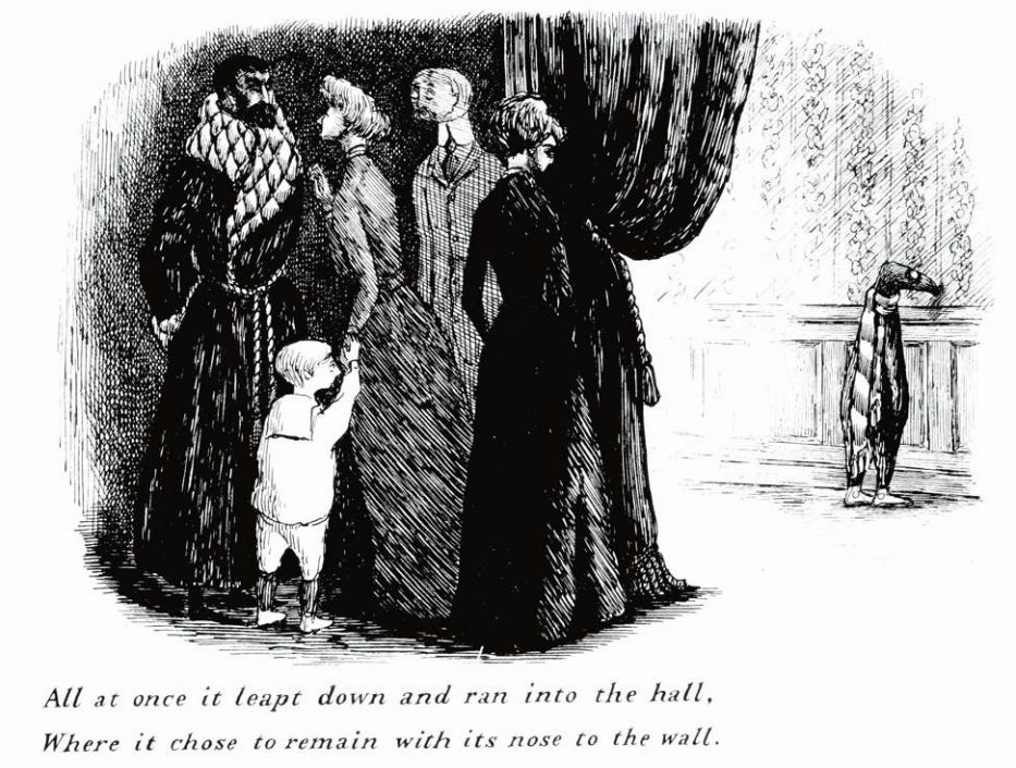 “All at once it leapt down and ran into the hall, where it chose to remain with its nose to the wall.”